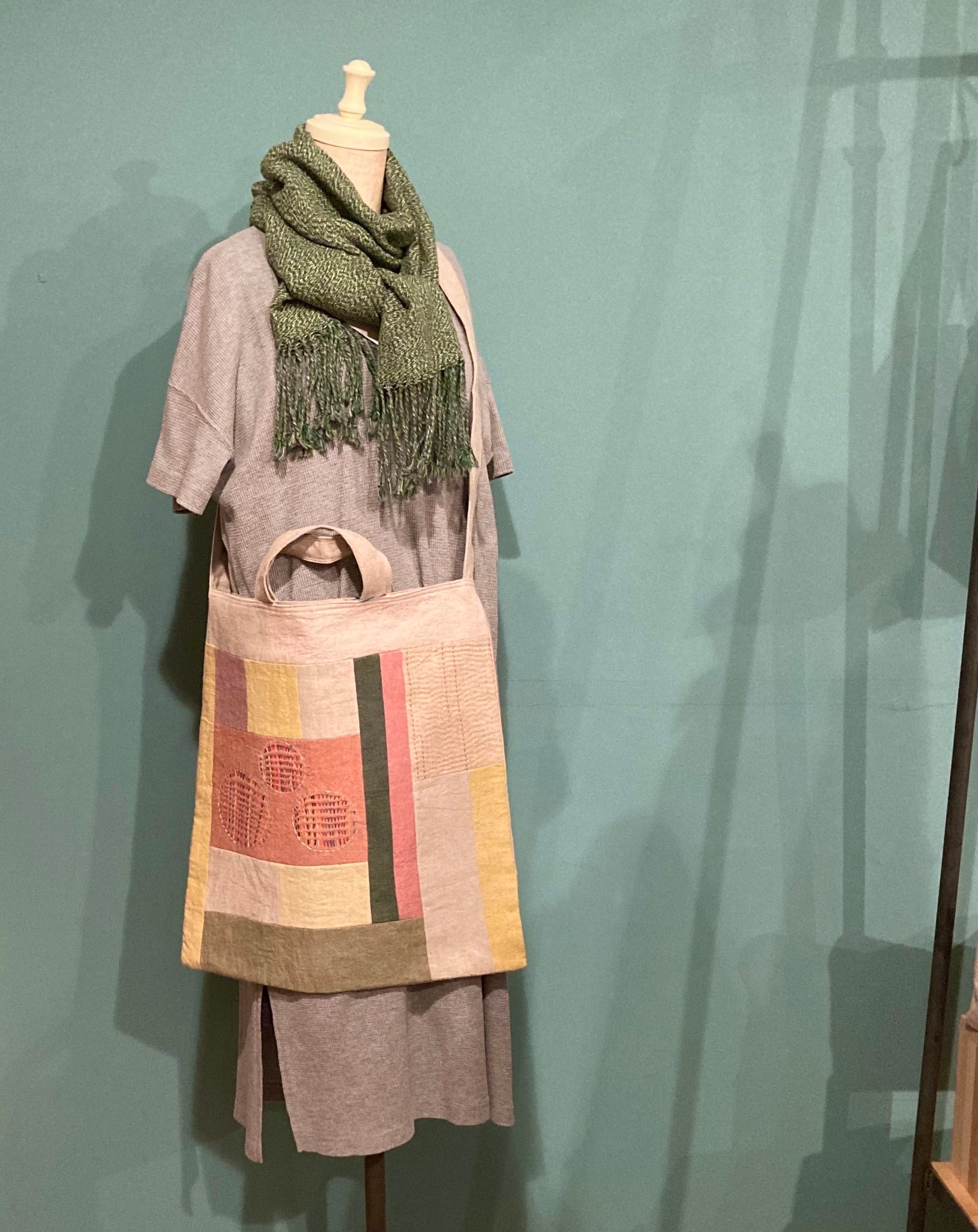 肩掛け、手提げの2通りの使い方ができ、ショルダーは、斜め掛けスタイルでも可能なたっぷり容量の2wayバッグ。内ポケットも大きく、スマホ、鍵など小物の整理収納もしやすい仕様です。表面がパッチワーク、裏面がリネンで仕上げています。