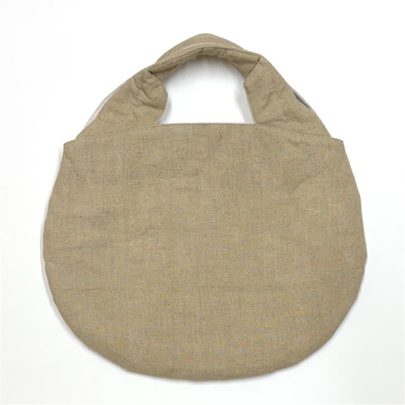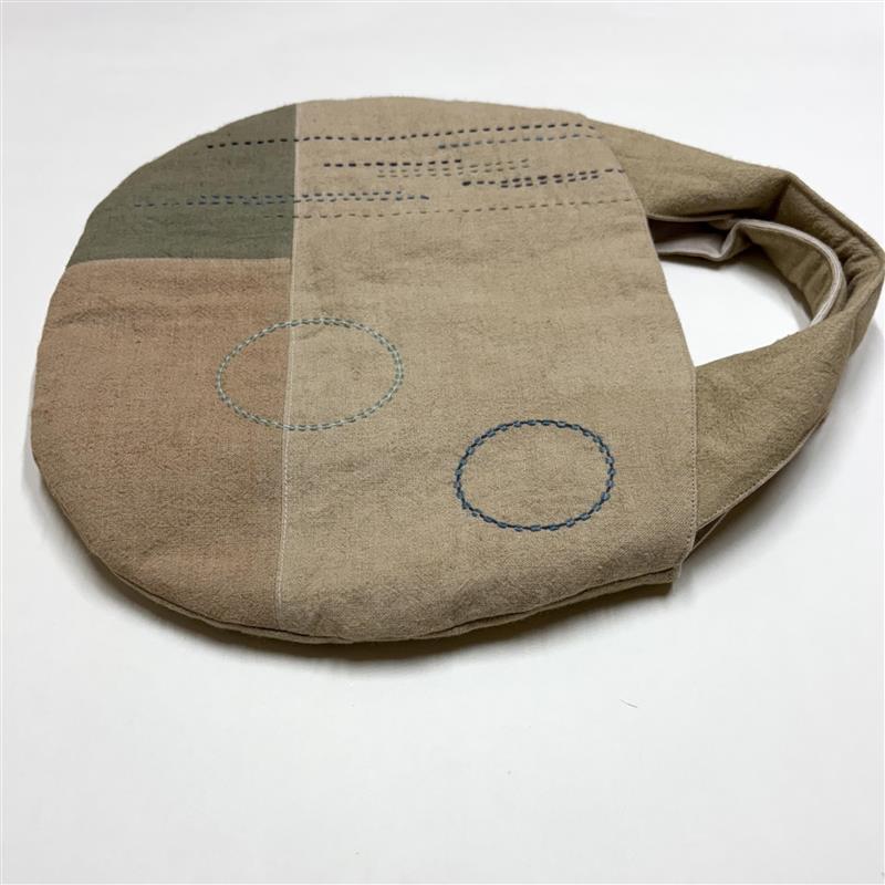 草木染めと刺し子を組み合わせ、全面と持ち手に中綿が入った優しい丸みのあるパッチワークバッグです。