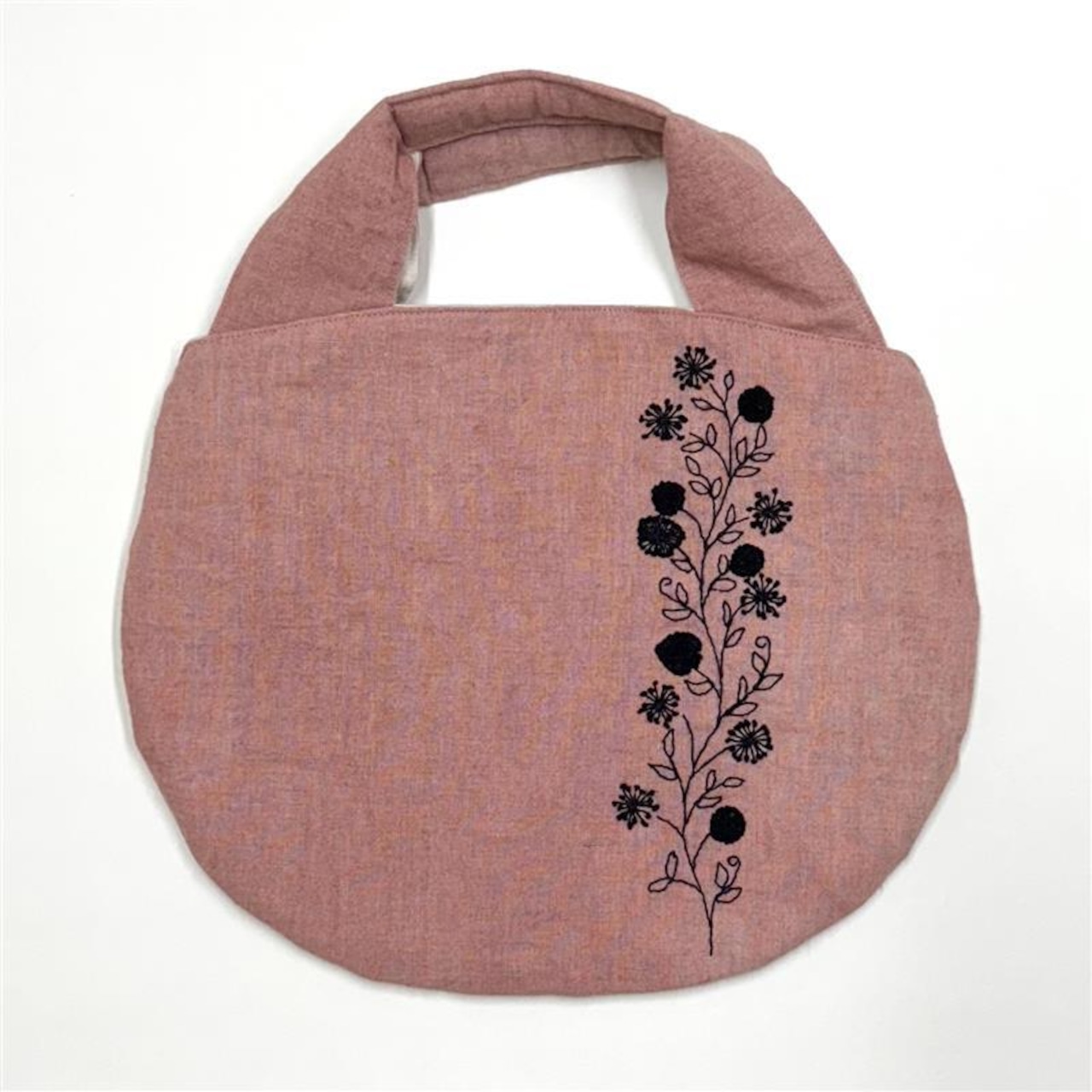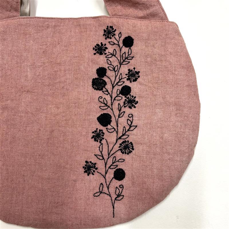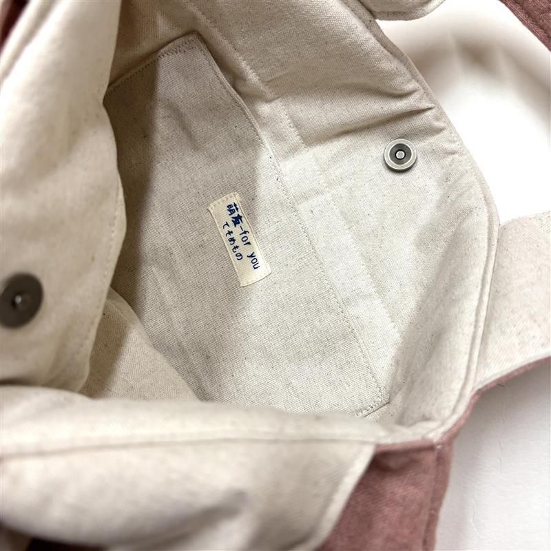リネンに萌友オリジナルの柄を刺し子の糸を使い、一針一針丁寧に刺繍したものと草木染めしたリネンを合わせ、中綿を全面と持ち手に入れており優しい丸みのあるバッグです。